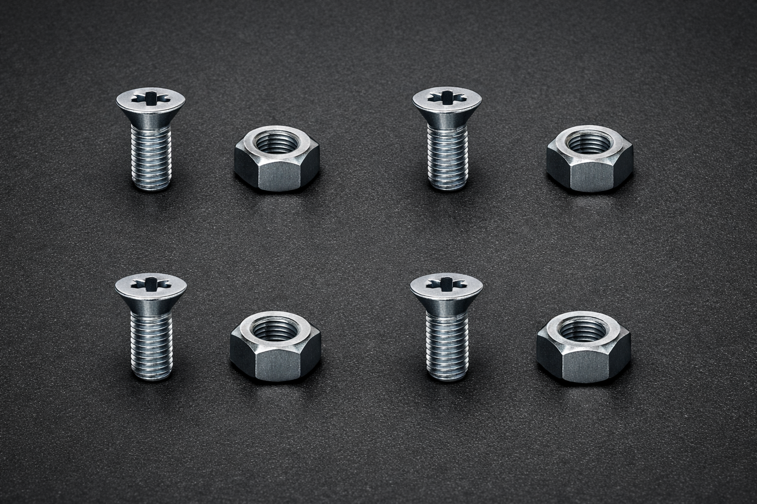 Fully threaded DIN 965 countersunk Pozi machine screws supplied with matching hexagon nuts for flush, secure fastening.