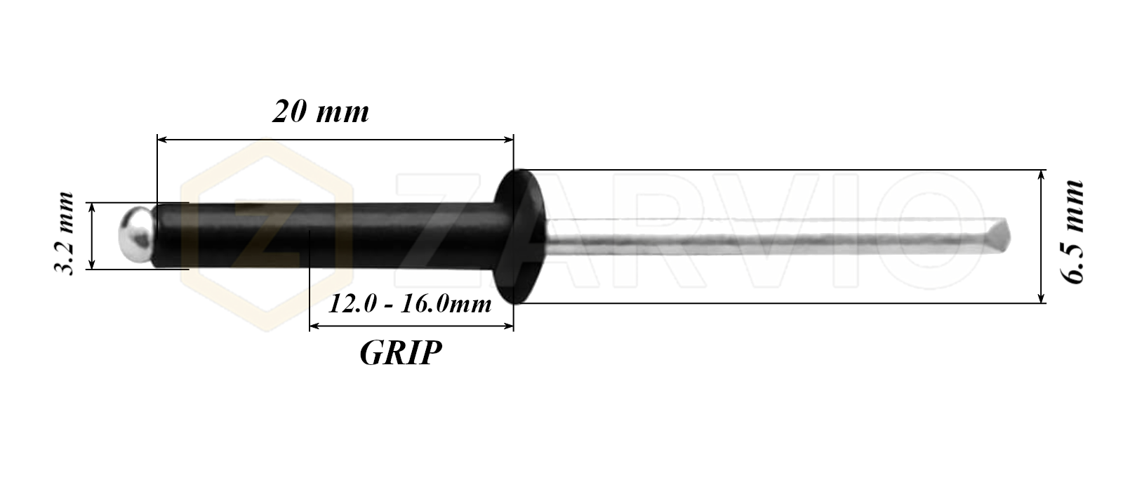 3.2mm x 20mm Black Blind Rivets ALU/STEEL Dome Head Pop Rivets – Aluminium Body Steel Mandrel
